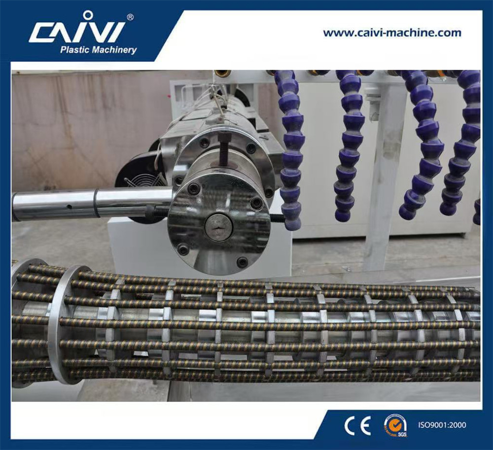 该生产线是用来生产PVC螺旋增强软管的,它包括两台挤出机、成型机、冷水槽、收卷机。软硬PVC螺旋增强管具有耐腐蚀、耐负压、耐弯曲和良好的流通性等特点。因而,该管材适合于输送气体、液体, 也被广泛地应用在工业、农业、建筑行业等领域